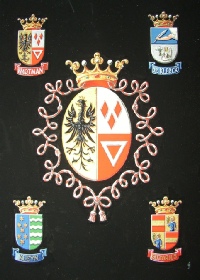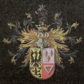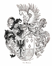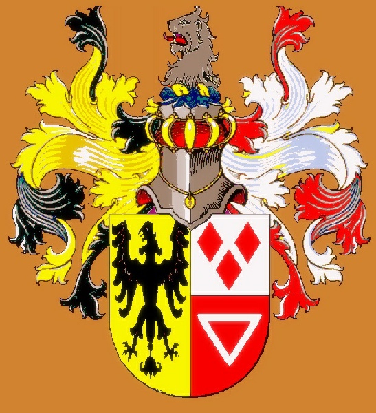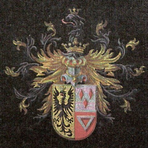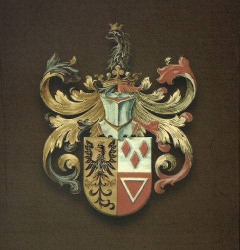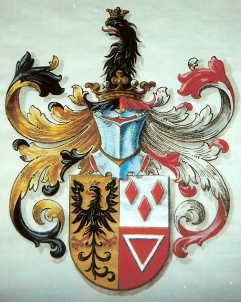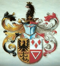 Het is gedeeld: I, in goud een zwarte, goudgekroonde en rood-getongde adelaar; II, doorsneden: a, in zilver naast elkaar drie opstaande rode ruiten, die de schildrand en elkaar raken en elkaar; b, in rood een zilveren triangel (driehoek) met een der punten naar beneden. Helmteken: een zwarte, goudgekroonde en rood-getongde adelaarskop en -hals. Dekkleden: rechts: goud en zwart; links: zilver en rood.
